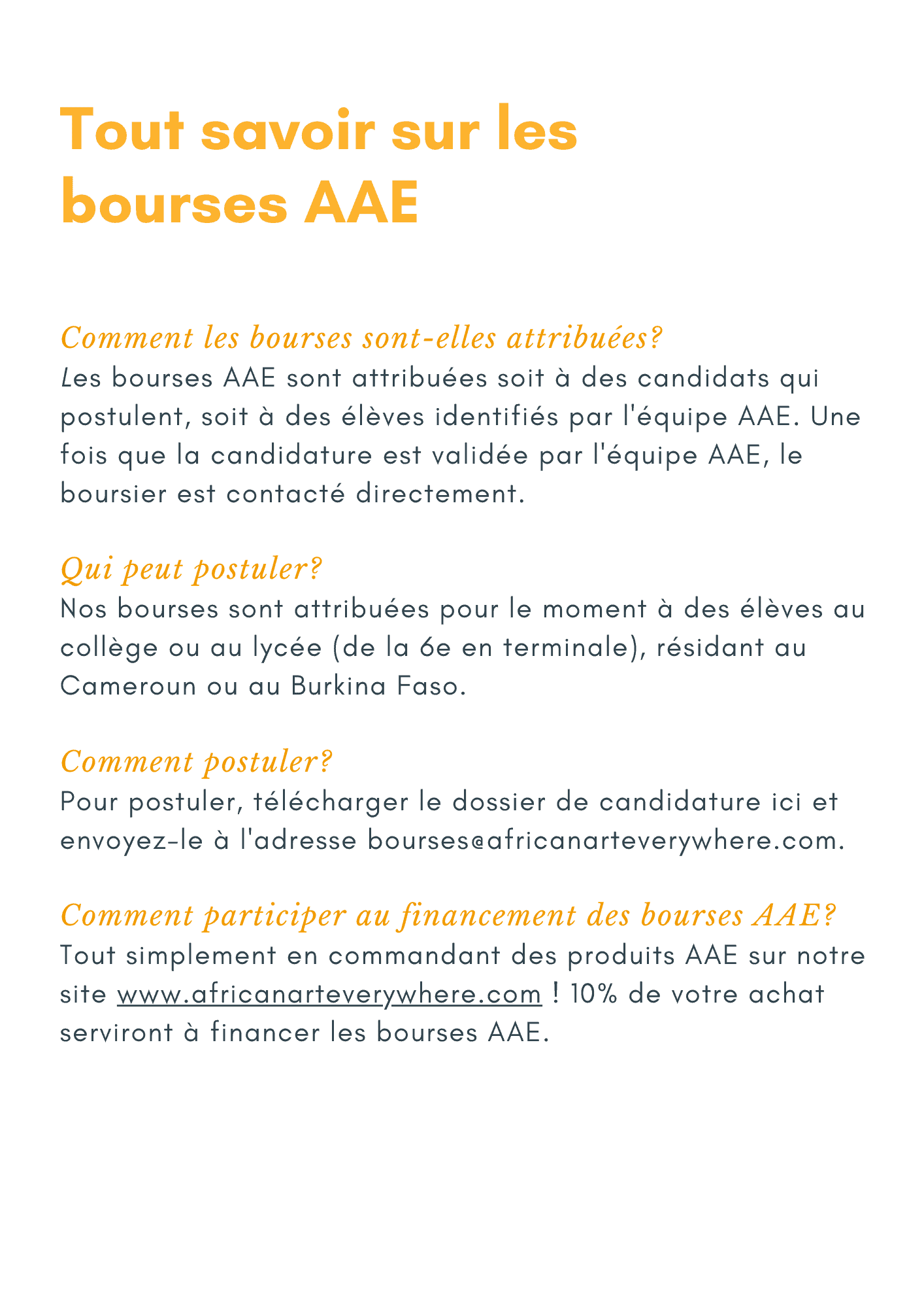Une initiative solidaire qui débute en 2021, année à laquelle nous avons distribué nos premières bourses d'études au Cameroun. Aujourd'hui le rêve se poursuit et nous sommes fiers d'œuvrer pour un cercle toujours plus vertueux. Pour voir les photos/vidéos de toutes nos distributions de bourses, c'est ici !