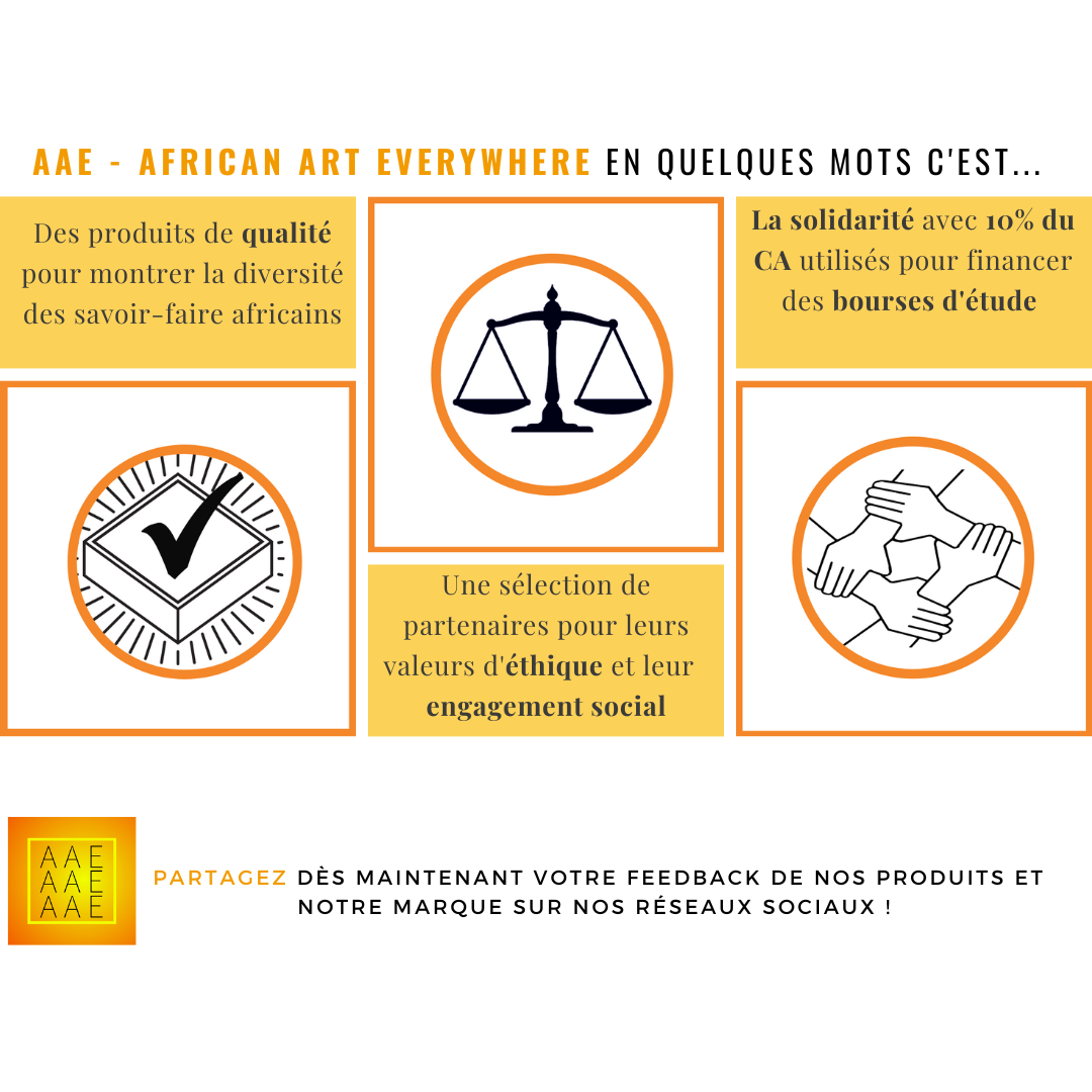 AAE c’est une équipe engagée qui propose une boutique en ligne d’articles d’art/déco/accessoires d’origine et d’inspiration africaines. Nous nous appuyons sur des valeurs de qualité, d’éthique et de solidarité. Nos produits sont réalisés principalement par des associations qui œuvrent pour l’autonomisation des femmes au Burkina Faso et au Cameroun. De plus, 10% de notre CA servent à financer des bourses et aides scolaires. Consommer AAE c'est soutenir un cercle vertueux alors n'hésitez plus et commandez !