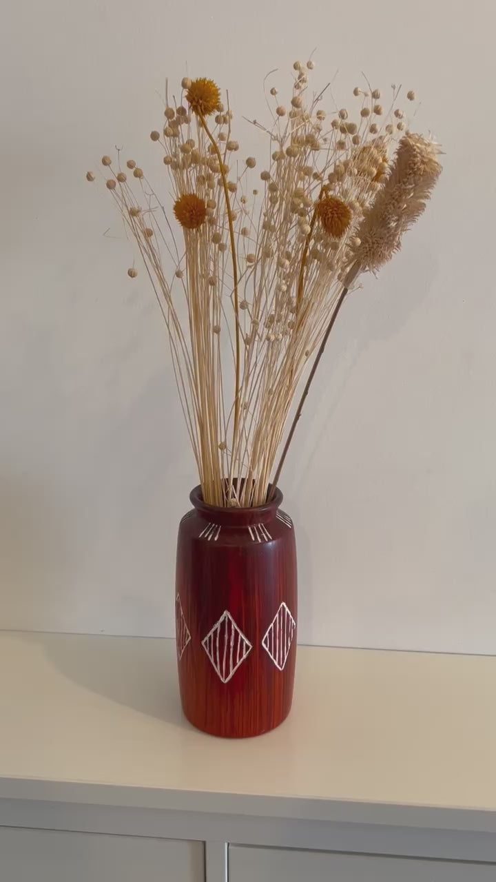 Ce vase en padouk, bois du Cameroun reconnaissable à sa couleur rouge foncé, est une pièce maîtresse alliant tradition et modernité, conçu avec un design soigné et une exécution minutieuse. Fabriqué à partir de bois local de haute qualité, chaque détail révèle la vision de notre designer et l'expertise de notre artisan. Ses lignes élégantes et ses motifs gravés à la main évoquent la richesse culturelle et l'esthétique naturelle de la marque. Parfait votre intérieur, ce vase apporte une touche chaleureuse et authentique, transformant n'importe quel espace en un havre de convivialité et de raffinement.